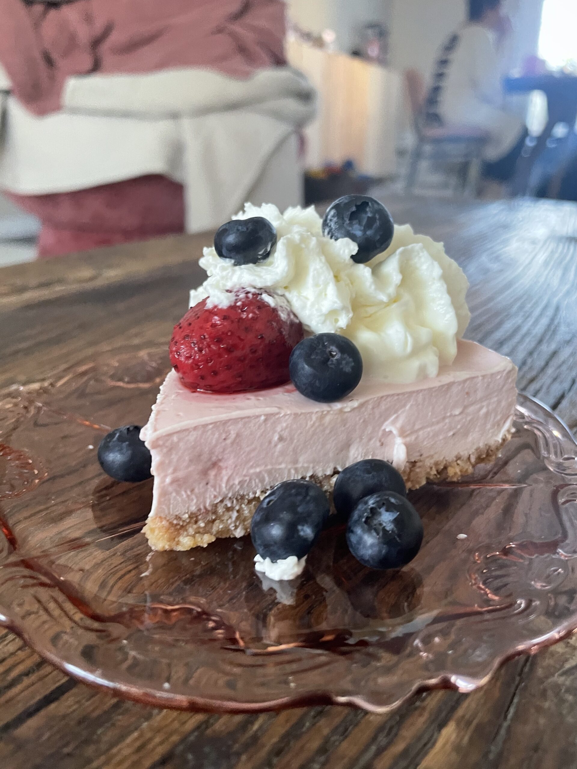 - Versier de taart met aardbei, evt. blauwe bessen en slagroom.